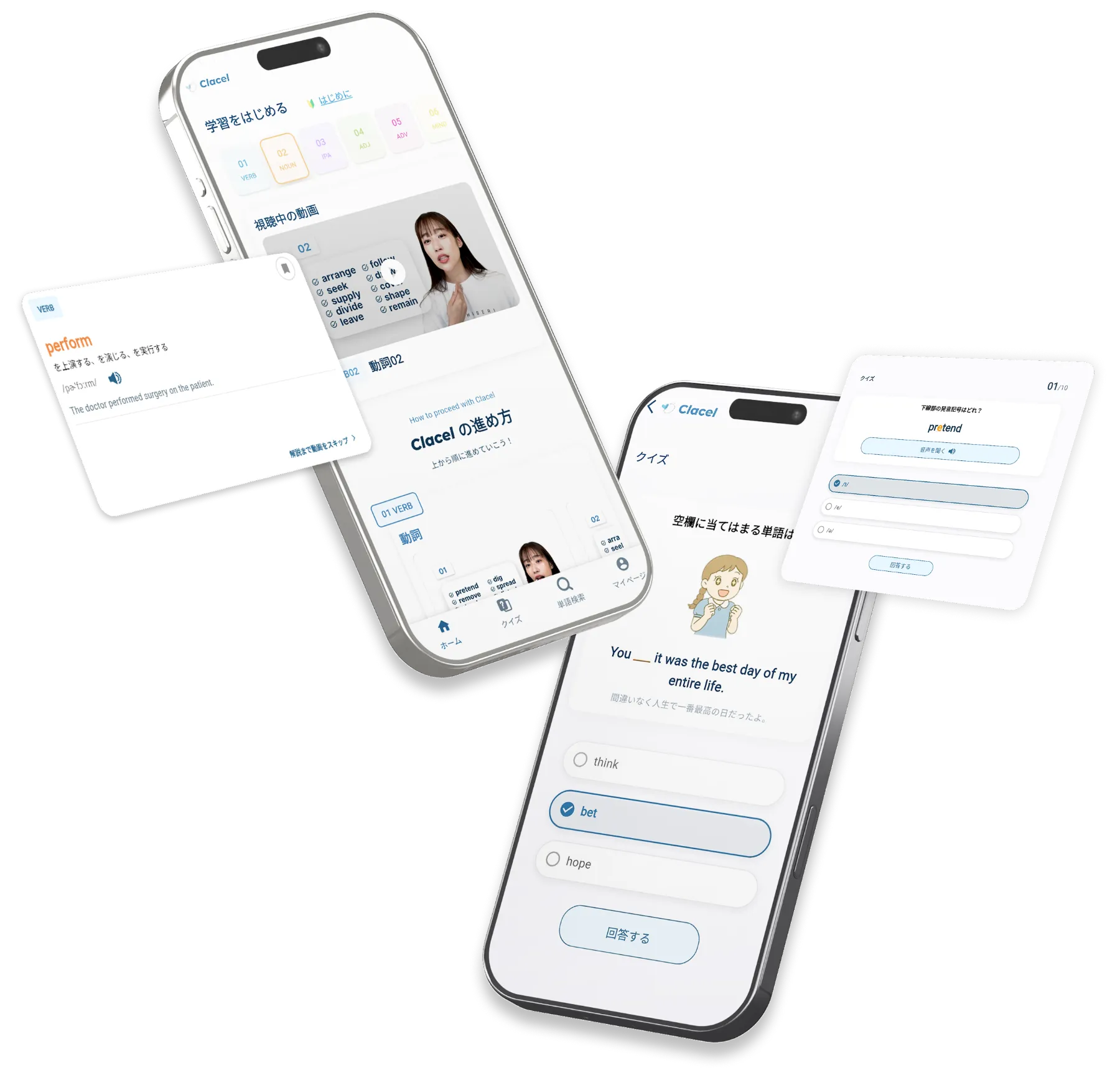 情報に溢れた現代、「量」が多すぎて「選べない」お悩みはありませんか?経験者が選び抜いた「必ず使う必要単語」を細かいニュアンスや現地での使い道、発音のコツまで一気に丁寧に学べる、それがClacelの特徴です。